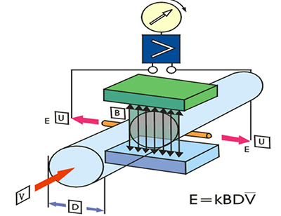 當(dāng)導(dǎo)電液體沿測量管在交變磁場與磁力線成垂直方向運(yùn)動(dòng)時(shí),導(dǎo)電液體切割磁力線產(chǎn)生感應(yīng)電勢。在與測量管軸線和磁力線相互垂直的管壁上安裝了一對(duì)檢測電極,將這個(gè)感應(yīng)電勢檢出。