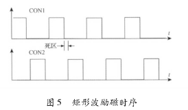 該電路主要由勵(lì)磁時(shí)序發(fā)生單元、三態(tài)緩沖器及隔離光耦組成。勵(lì)磁時(shí)序由電磁海水流量計(jì)系統(tǒng)的控制核心產(chǎn)生。采用DSP的EPWM外設(shè)模塊,通過(guò)設(shè)定其內(nèi)部定時(shí)器的工作模式發(fā)出所要求的勵(lì)磁頻率的勵(lì)磁時(shí)序PWM信號(hào)CT_1和CT_2。由于勵(lì)磁控制系統(tǒng)中的勵(lì)磁工作電源的電壓要比DSP的工作電源電壓高得多,為防止勵(lì)磁電路故障對(duì)系統(tǒng)控制核心產(chǎn)生致命影響,采用光耦將控制部分與勵(lì)磁部分進(jìn)行隔離。另外,由于DSP引腳的驅(qū)動(dòng)能力有限,所以在DSP與隔離光耦之間加入三態(tài)緩沖器以驅(qū)動(dòng)隔離光耦的輸入級(jí)。并且,DSP能夠通過(guò)GPIO口控制三態(tài)緩沖器上的使能引腳來(lái)使能和禁止勵(lì)磁,以在檢測(cè)到電路故障時(shí)迅速關(guān)斷H橋所有橋臂。該勵(lì)磁時(shí)序產(chǎn)生電路通過(guò)軟件編程可產(chǎn)生如圖5所示的單頻矩形波。在實(shí)際應(yīng)用中,由于組成H橋的達(dá)林頓三極管與MOS管導(dǎo)通與關(guān)斷的時(shí)間不一致,易在勵(lì)磁方向切換瞬間,產(chǎn)生上下橋臂同時(shí)導(dǎo)通的現(xiàn)象,反映在勵(lì)磁電流波形上為一幅值很高的窄脈沖。該脈沖電流不僅容易引起遲滯比較電路的誤輸出,從而導(dǎo)致高低壓切換電路與電流旁路電路的誤動(dòng)作,而且對(duì)恒流控制電路產(chǎn)生沖擊,減小三端穩(wěn)壓芯片的使用壽命,同時(shí)還會(huì)產(chǎn)生EMC電磁干擾,給測(cè)量精度帶來(lái)影響。所以實(shí)際應(yīng)用時(shí),如圖5所示對(duì)方波勵(lì)磁時(shí)序添加死區(qū),可以明顯減小上述現(xiàn)象。