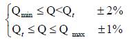 由圖2 可見,儀表系數可分為二段,即線性段和非線性段。在非線性段, 實際特性受軸承摩擦力、流體粘性阻力影響較大。當流量低于Qmin 時,儀表系數隨著流量迅速變化。壓力損失與流量的平方成正比關系。通常線性段約為工作段的2/3,其特性與渦輪結構參數及流體粘性有關。隨流量的變化其儀表系數K 也會有一定的變化,但變化不大,通常將其變化幅度稱為流量計的計量準確度。對于產品設計而言,期望能將線性段的流量范圍拓展,一臺流量計能覆蓋同口徑的不同流量范圍,使得產品量程比變寬從而降低生產管理與生產批量加工成本。對于1.0 級的高壓機油流量計,以Qt(0.2Qmax)為分界流量點,將計量線性分為兩段,其中一段的*大允許誤差為±2%,而另一段的*大允許誤差為±1% 。按圖2 所示,通常每臺渦輪流量計均有較為相似特性曲線,若將可測量流量范圍做寬,就能在同口徑不同流量范圍進行分段截取,以實現一臺流量計能覆蓋同口徑的不同流量范圍。
