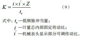 根據實際流量計的所測得儀表系數K 更換對應齒輪傳動比,使機械表頭顯示部分和齒輪轉動發出低頻脈沖輸出均與高頻脈沖輸出匹配,實際三者關系如下: