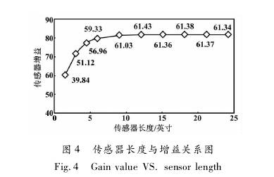 采用一臺日徑為6英寸、標準線圈的傳感器,改變傳感器長度,依次進行試驗室標定試驗。傳感器長度與增益的關系圖如圖4所示。當傳感器長度為9. 1英寸時,其增益為61. 03;但當其長度繼續(xù)增加時,增益變化較小;當其長度6. 1英寸減小到0時,增益從59. 33開始下降。也就是說,當傳感器長度為6. 1-9. 1英寸時,既有效利用了線圈產生的磁場,又可使傳感器長度較短。