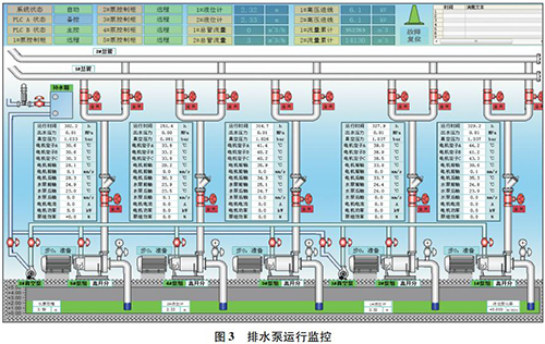 泵房自動(dòng)化監(jiān)控系統(tǒng)實(shí)時(shí)監(jiān)測水泵各工況參數(shù),含水倉水位、水泵運(yùn)行電壓、電流、排水壓力、單管流量、引水真空度等,控制水泵、電動(dòng)閘閥、真空泵的開停,及水泵排水電耗統(tǒng)計(jì)( 如圖 3 所示) 。其主要數(shù)據(jù)收集如下。