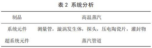 建立已有系統(tǒng)的功能模型(見圖 1)。通過功能模型分析,描述了系統(tǒng)元件及其之間的相互關(guān)系,并得出導致傳感器耐受溫度不足問題的功能因素:高溫蒸氣對測量管傳熱;測量管對探頭傳熱;探頭對灌封物傳熱;灌封物對壓電陶瓷片傳熱;高溫蒸氣對探頭傳熱。