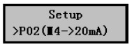 1)在分體式超聲波液位計正常工作時按擊Mode鍵進入參數設置菜單后按擊▼鍵選擇P02(4~20mA)設置菜單,如右圖。